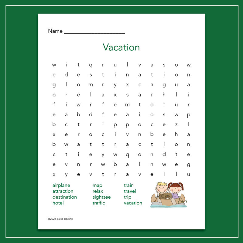 The vacation-themed word search worksheet includes: