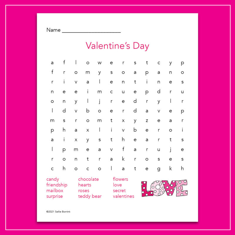 The Valentine’s Day word search features these words: