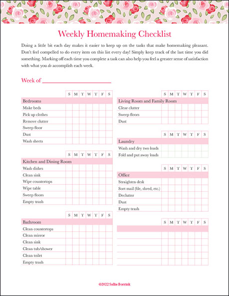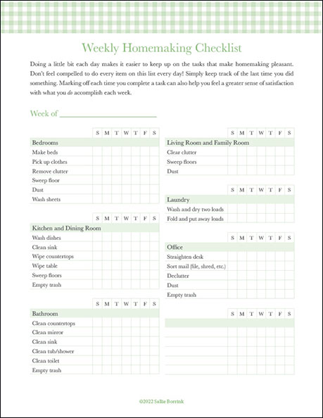 That’s why I created a free printable Weekly Homemaking Checklist. I think of this printable not as a demanding checklist to be followed, but a place where I can keep track of what I’ve done. Instead of taking up valuable brain space trying to remember the last time I did something, I can look at my list and know for sure if I’ve tackled a particular task that week.