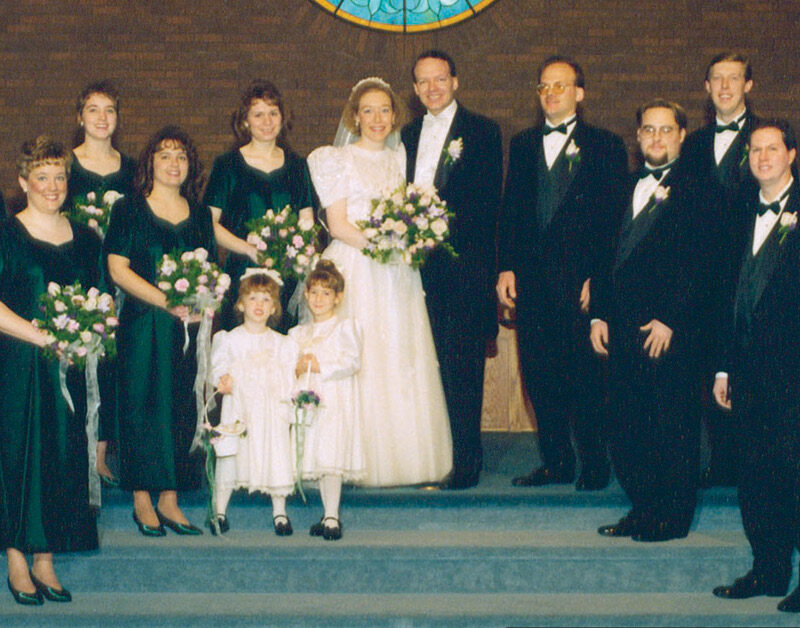 After buying the first wedding dress I tried on (another story!), my maid of honor (Katherine) and I discussed the bridesmaids’ dresses. I don’t remember exactly how this line of thought developed, but in the end I realized I wanted the women to wear the Talbots dress! Of course, they were long gone from the stores and no longer available to order. But Katherine was friends with a woman who designed clothes and patterns as a business. We went to see Jana and showed her the dress. She said she could definitely make a pattern and make them. So she went to work on them.