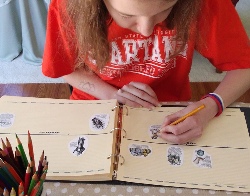 I made the decision that I would locate and cut out the timeline figures. We find the placement suggestion in the guide together. Caroline glues them in, reads them aloud for us, and colors them.