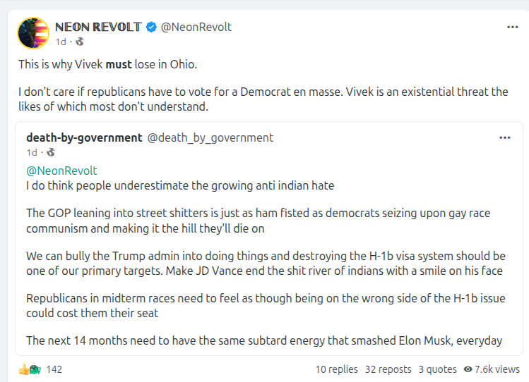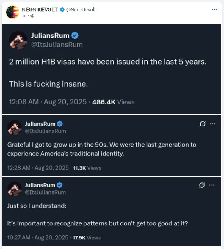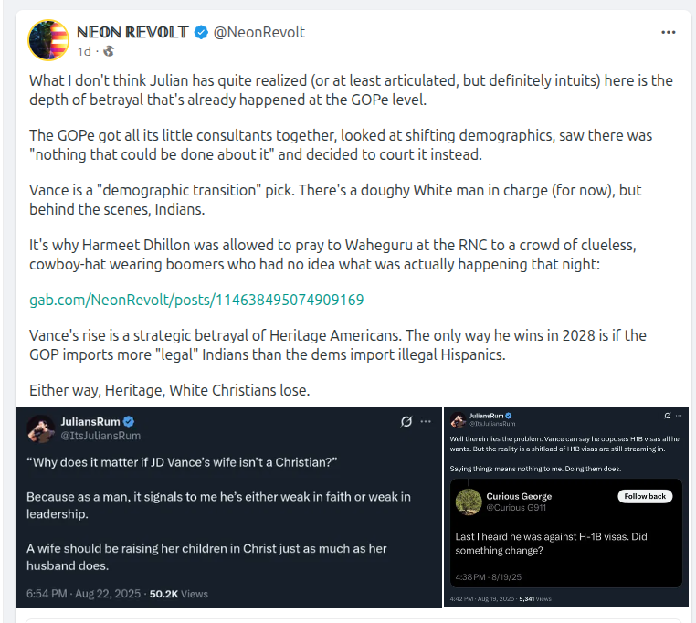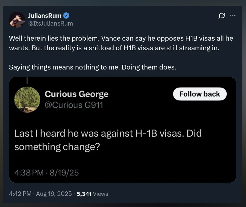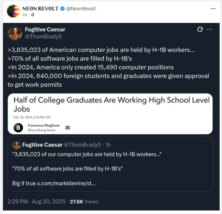 This is the very reason Americans need to be hired with the skills and experience, and these H1-B visas get tossed, kicked out and the entire program revamped. Americans need to be first priority in hires for jobs if they have the necessary skills and experience. Visa people need to be secondary. JD Vance and others had better consider that as his bias is clearly showing which is not helpful for new policy or Americans. Americans First PLEASE!!