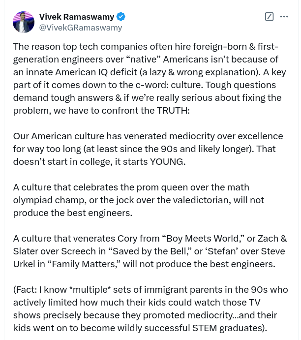 I’ve made it clear in other posts that I am not a fan of Vivek Ramaswamy. He gives me the same vibe Obama gave me (thoroughly dishonest liar out for himself and who uses America while secretly disliking Americans BUT who gets promoted by White people who are desperate to support someone not White so they can prove to themselves and their friends they aren’t a racist). I am hoping to do a few targeted posts about what happened on Twitter last week regarding legal immigration, Indians, rampant H1-B fraud, etc.