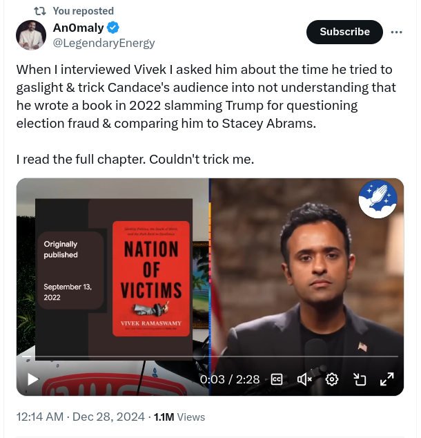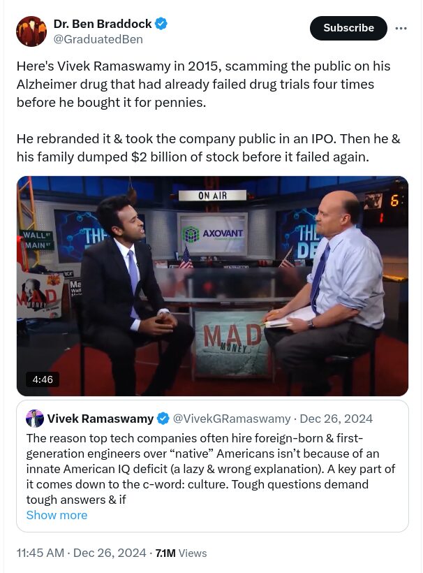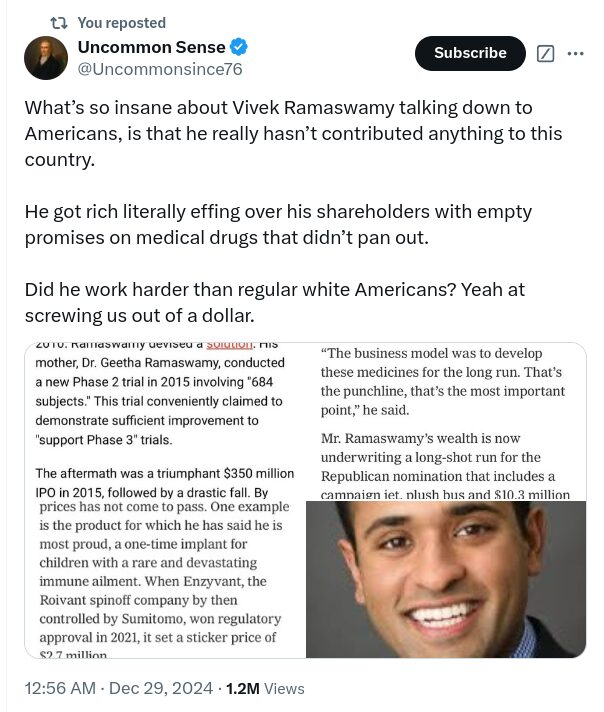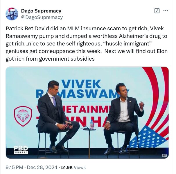 Why did Trump promote him to do DOGE? Trump often pushes people to the front to expose them. Maybe that’s the case here? It seems hard to believe that Trump didn’t know all of this about Vivek.