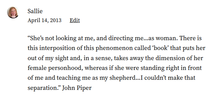 I hope everyone reading this can see how utterly absurd this argument is. Piper is fine with a woman writing a book. He’s fine reading it. He’s even apparently fine with learning from the book written by the woman. He’s just not fine being aware that someone with a “female personhood” wrote the book he’s learning from. He’s fine reading the content from a book, but if the female author stood in front of him and said the exact same thing, it would be a problem according to his interpretation of God’s Word.