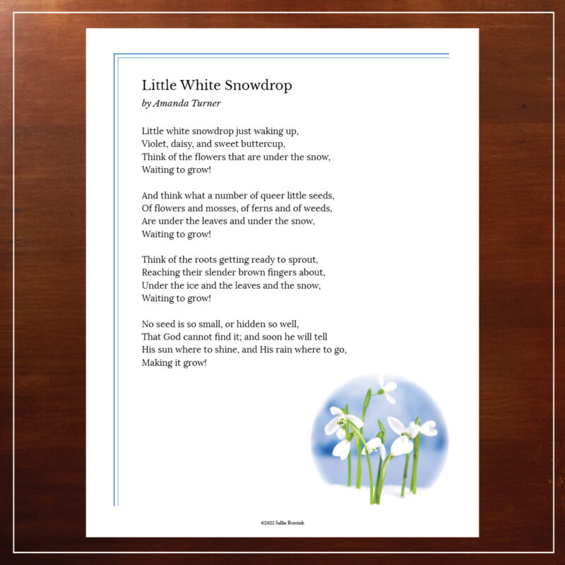 Download and print this cheerful spring-themed poem for your homeschool from my printables shop. Read “Little White Snowdrop” by Amanda Turner with your children and discuss the signs of Spring your family looks for.