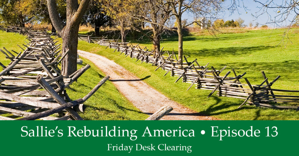 Welcome to Friday’s episode of Sallie’s Rebuilding America. Since it’s Friday, we’re going to look at a whole bunch of topics and group them under: