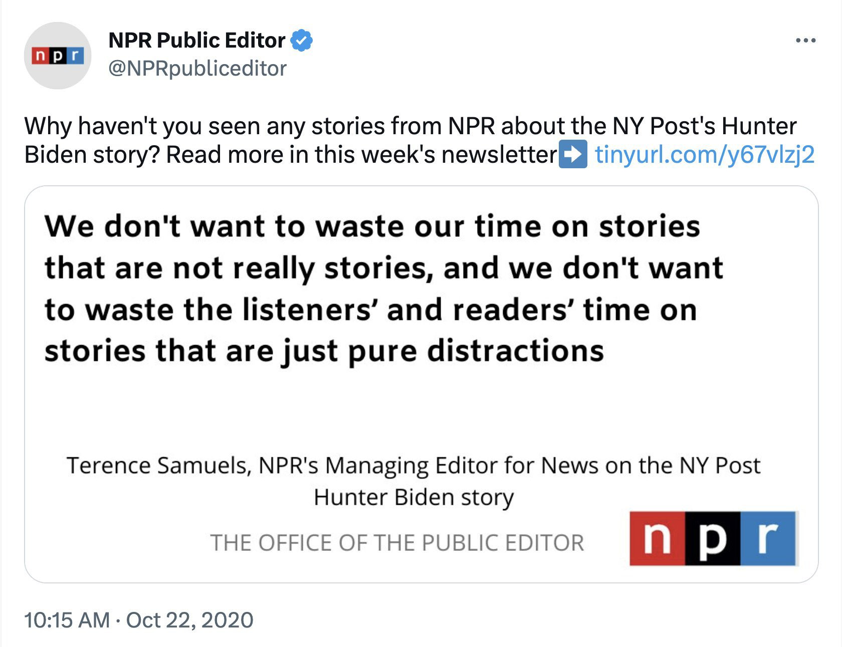 So you might remember that in October 2020 NPR refused to cover the Hunter Biden laptop story. This was the reason they gave at the time.