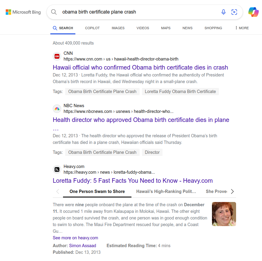 The woman who said the birth certificate was real ended up dying in a plane crash in the water. Everyone else survived.