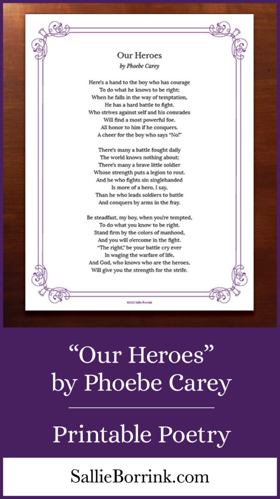 Use the stirring poem “Our Heroes” by Phoebe Carey to celebrate the boys in your life. This printable poem from my shop tells of the battles boys wage to be courageous, honorable, and do what is right.