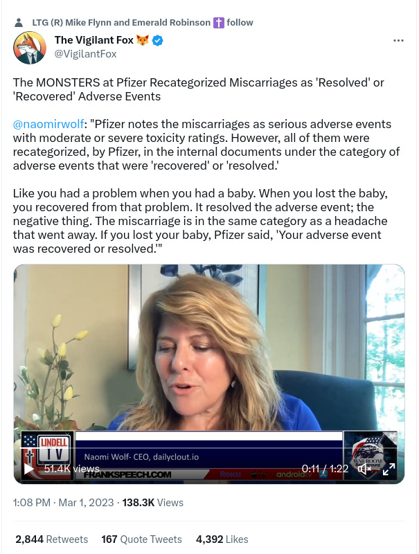 The MONSTERS at Pfizer Recategorized Miscarriages as 'Resolved' or 'Recovered' Adverse Events@naomirwolf: "Pfizer notes the miscarriages as serious adverse events with moderate or severe toxicity ratings. However, all of them were recategorized, by Pfizer, in the internal… https://t.co/H2JFhFYwXB pic.twitter.com/BnfNmO0fBF