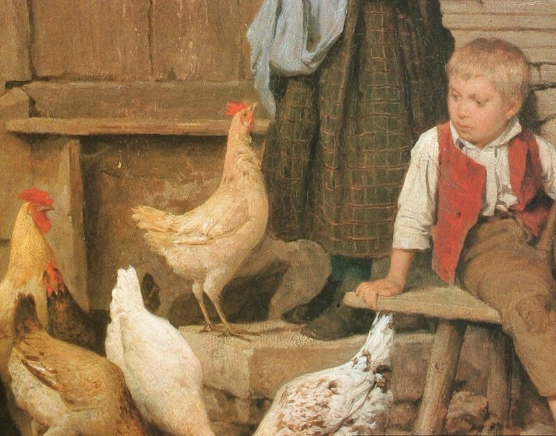 Artist: “Mother and son in barnyard feeding chickens” by Albert Anker