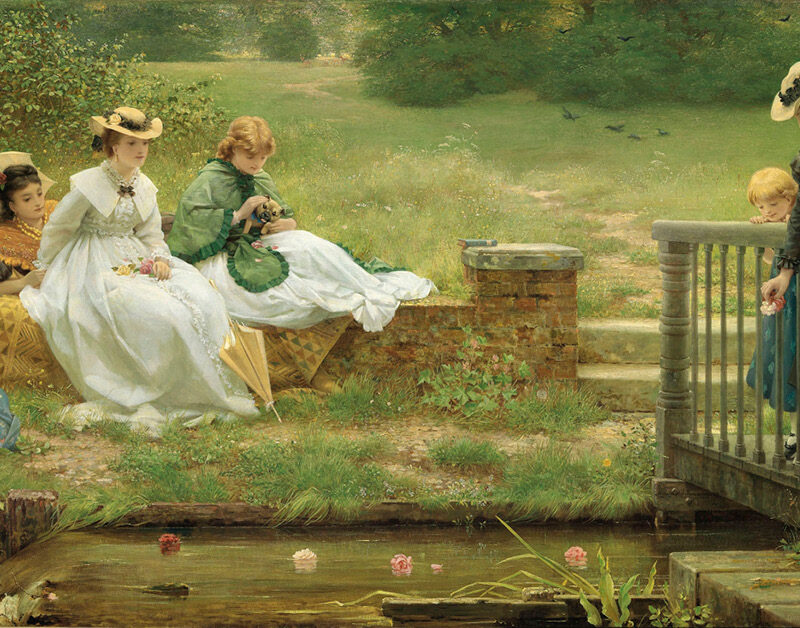 This is the prime version, unseen since its appearance at Christie’s in 1902, of one of Leslie’s most celebrated pictures which was exhibited at the Royal Academy in 1870. A reduced replica can be found in the Walker Art Gallery, Liverpool (no. 393). The title of the picture, derives its name from the game, better known to modern audiences as ‘pooh-sticks’, whereby the girls are casting flowers into a stream, to predict their marital fortunes. Some have a smooth course, while others are less lucky. Dunlop Leslie’s aim, however was to ‘paint pictures from the sunny side of English domestic life, and as much as possible to render them cheerful companions of their possessors’. He saw his times as imbued with ‘turmoil, misery, hard work and utilitarianism’ and he believed that images of innocence, joy and beauty were things he could usefully contribute to society.