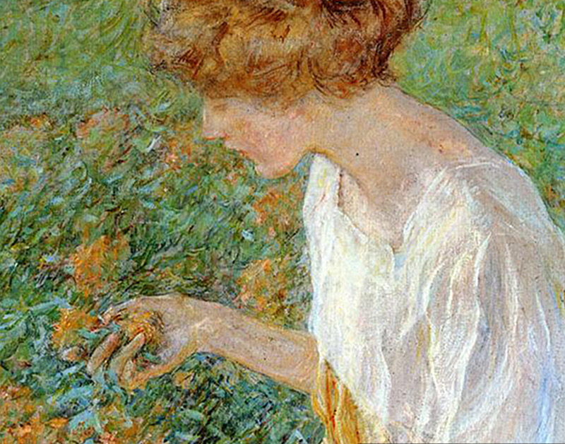 Today I’m featuring a new artist. Robert Reid painted The Yellow Flower aka The Artist’s Wife in the Garden in 1908.