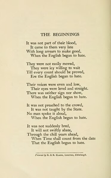 “The Beginnings” is a 1917 poem by the English writer Rudyard Kipling. The poem is about how the English people, although naturally peaceful, slowly become filled with a hate which will lead to the advent of a new epoch.