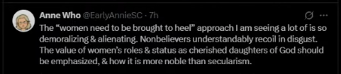 Many of these men have very little practical and real-world experience in dealing with these questions as they impact real women. Many of these men are newly married or have young families. As a woman who was single until 29 and didn’t have a living child until age 39 (neither one by deliberate choice), I look at these questions very differently. I know the practical outworking of these increasing calls for limitations on women. If you really want to deep dive into that, go through the posts I have under the True Womanhood Blog tag on my website from roughly 2007. We’ve already been down this road before. It ended horribly.