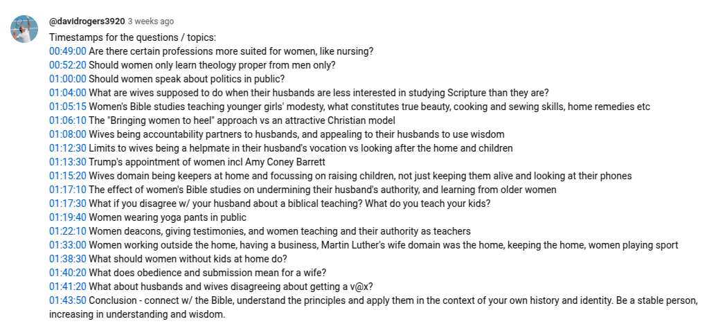 There is a reason Jon is discussing these topics. There is a growing group of younger and middle aged men in parts of the conservative Christian church who think increasing limits need to be put on women. Some of them would basically limit women to only doing things at home. I’ve written about this a bit in Vision Forum 2.0 and Patriocentricity Again | Joel Webbon on Women and Women Are Born That They May Acknowledge Themselves As Inferior. This is a very real thing and it is impacting young men.