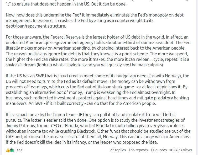 If the US has an SWF that is structured to meet some of its budgetary needs (as with Norway), the US will not need to turn to the Fed as its default move. The money can be withdrawn from proceeds off earnings, which cuts the Fed out of its loan shark game – or at least diminishes it. By establishing an alternative pot of money, Trump is weakening the Fed almost overnight. In business, such redirected investments protect against hard times and mitigate predatory banking manuevers. An SWF – if it is built correctly – can do that for the American people.