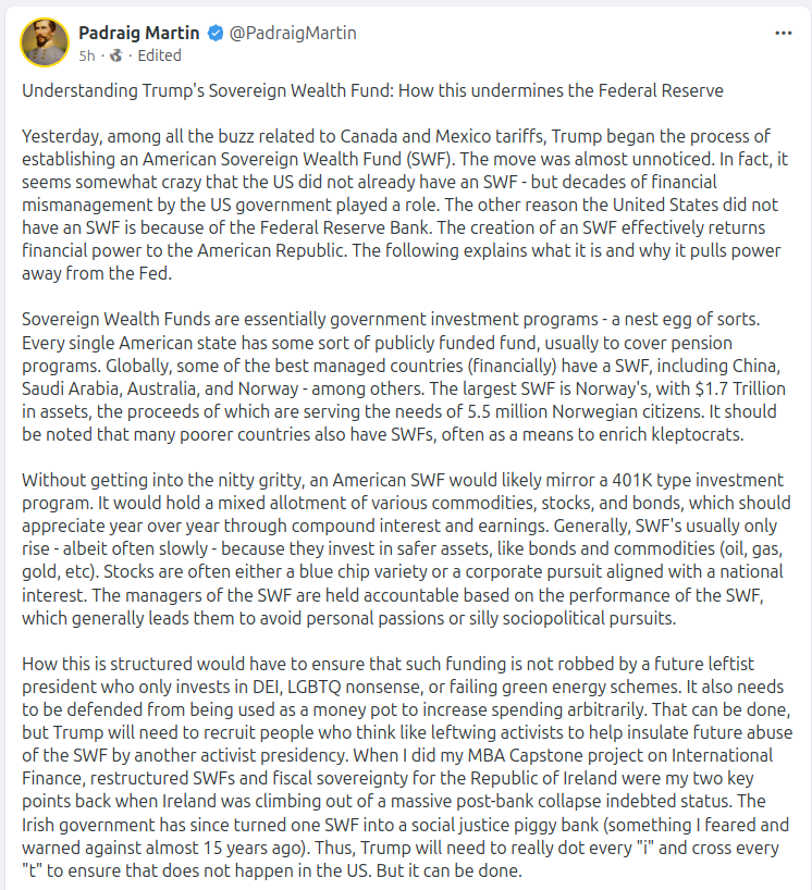 Yesterday, among all the buzz related to Canada and Mexico tariffs, Trump began the process of establishing an American Sovereign Wealth Fund (SWF). The move was almost unnoticed. In fact, it seems somewhat crazy that the US did not already have an SWF – but decades of financial mismanagement by the US government played a role. The other reason the United States did not have an SWF is because of the Federal Reserve Bank. The creation of an SWF effectively returns financial power to the American Republic. The following explains what it is and why it pulls power away from the Fed.