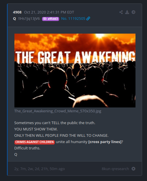 I’ve been thinking about finally moving all of my Q-related research from the forum to the main website. I think we’ve received the signal that it is time. Go here to see it: Q & The Great Awakening.