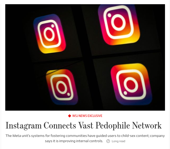 So I thought we were going to be focusing on a different topic this week (UFOs and aliens), but it looks like we’ve got two big stories rising to the top. The Wall Street Journal (!) is reporting today on the rampant pedophile network on Instagram (which is owned by Facebook/Meta/Zuckerberg).