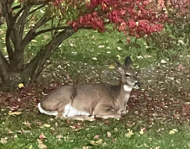 (The photo is Millie, our daily deer, resting under our neighbor’s burning bush tree this week. Caroline took the picture.)