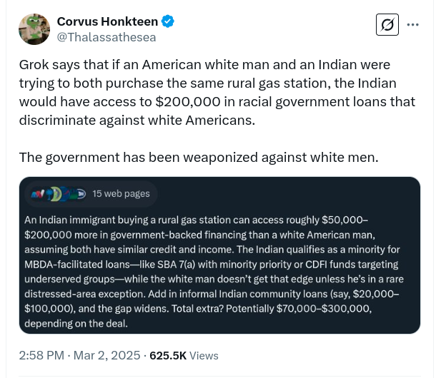 Massive racial government loans that discriminate against White Americans. You can read the entire thread with many more details here. But people like Vivek tell us it’s because Americans are lazy and not willing to work. And you know he’s primarily addressing White Americans when he’s slamming those who live here (even while we discovered he is an anchor baby this week).